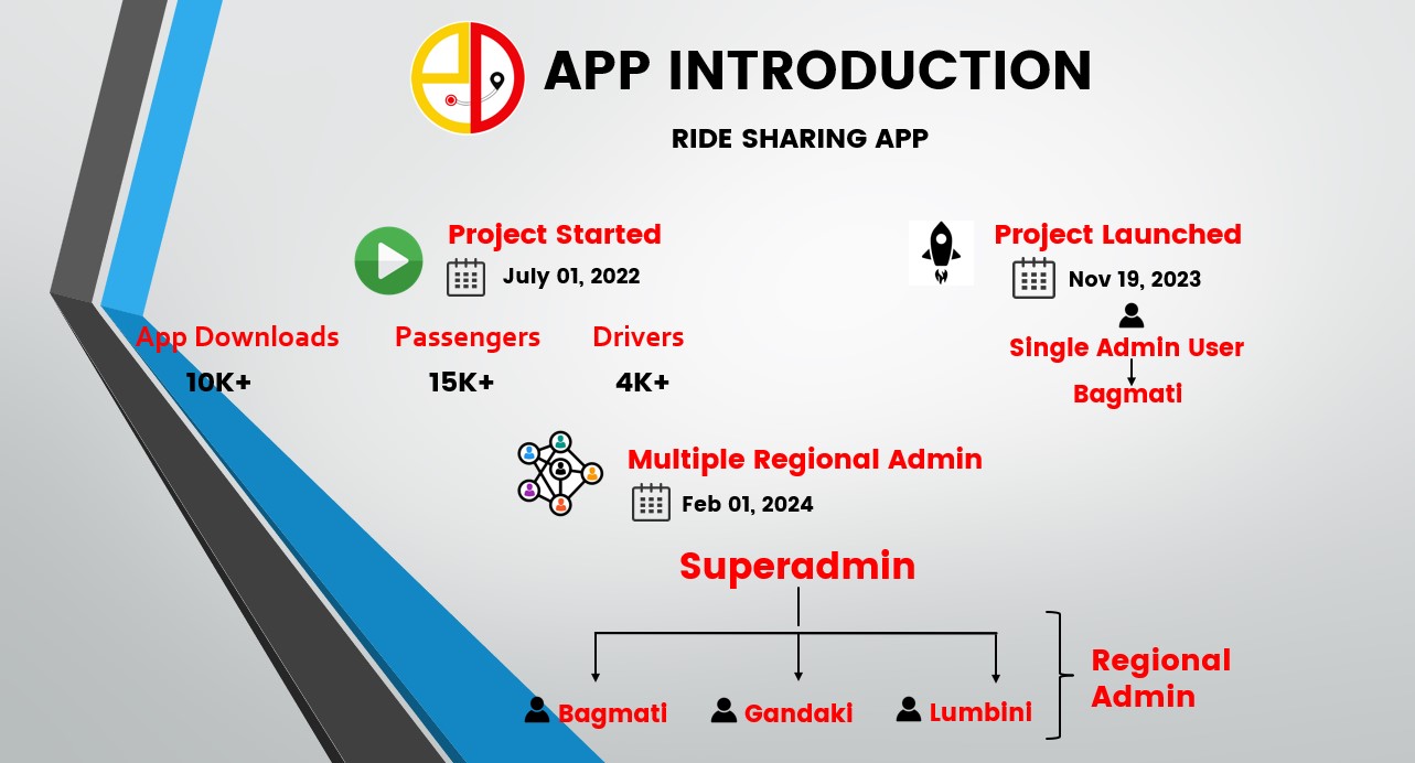 Edrive Nepal is the ride-sharing service provider in Nepal. The app development project started on July 2022. The project was successfully launched on 19 Nov, 2023. After successful execution of eDrive in Kathmandu, the app extended its feature to run on other regions such as Pokhara and Bhairawa. The app is made region based.